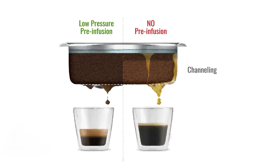 Ngoài ra, quá trình pre-infusion còn giúp cà phê được thấm đều nước, tăng sự chiết xuất đồng đều và giảm những sai sót của barista hoặc chất lượng hạt xay, ngăn ngừa hiện tượng channeling – hiện tượng mà nước chảy nhanh và tập trung vào một khu vực nhất định.
